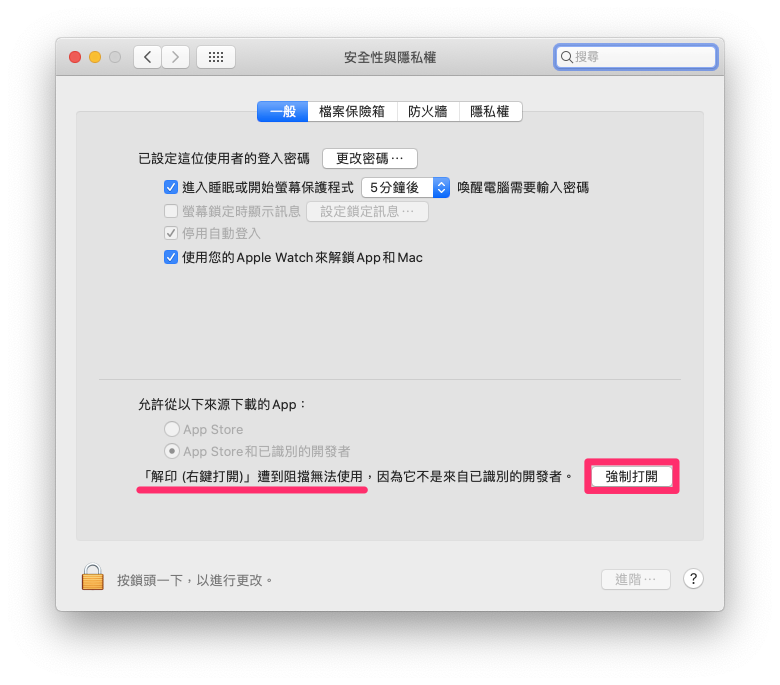 在這裡,會看見下方顯示系統剛阻擋了 app 開啟的動作,只要點選「強制打開」就可以囉。