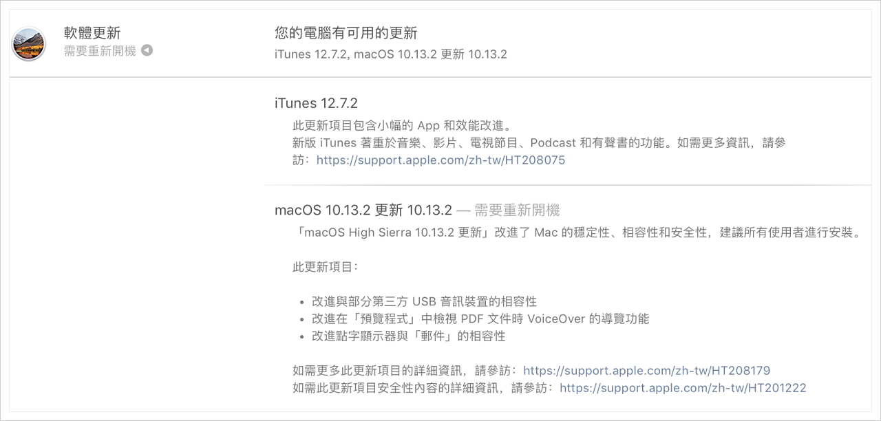 「macOS High Sierra 10.13.2 更新」改進了 Mac 的穩定性、相容性及安全性,建議所有使用者進行安裝。