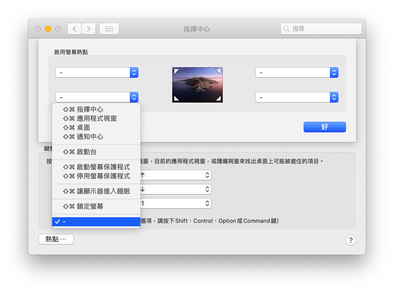 「但是,我常常不小心碰觸到角落,一直觸發熱點動作,好煩!」 如果擔心因為游標移動而造成不必要的動作,可以在選單出現的時候,同時按住例如 Command、Option、Control 等快速鍵,就會看見選項出現了該按鍵的符號。