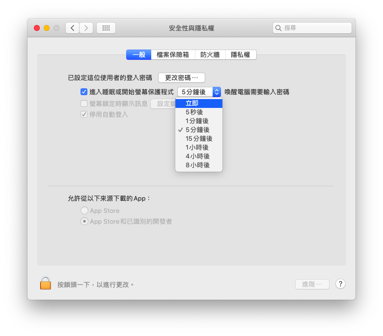 進入「系統偏好設定」的「安全性及隱私」畫面,將「進入睡眠或開始螢幕保護程式」的等候時間調成「立即」,如此一來就能萬無一失囉!