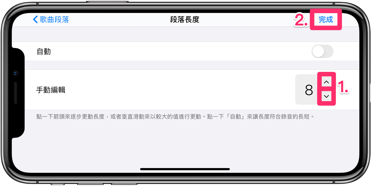 接著只要在「手動編輯」項目右方點擊【∧】或【∨】即可調整歌曲的小節數。調整到數字 12~14 之間,歌曲長度大約就會落在 GarageBand 製作鈴聲限制的 30 秒左右。