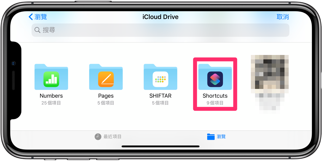 接著進入到【iCloud 雲碟】中,進入剛剛儲存轉好的 M4A 檔的【Shortcuts】資料夾。