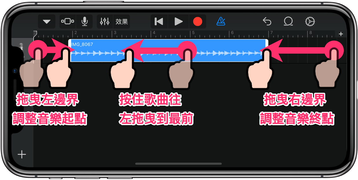 將 M4A 檔放到 GarageBand 後,可以【調整左、右方邊界】,以及按著【歌曲向左拖曳】等方式,來調整鈴聲的起始、結束點與鈴聲長度。