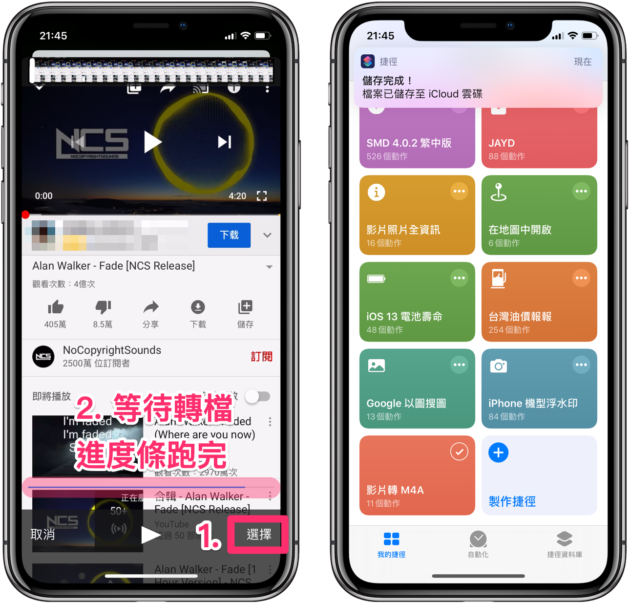點一下影片右下角的【選擇】,最後等待一會讓捷徑執行轉檔動作完成,轉好的 M4A 檔就會自動存到 iCloud 雲碟中的「Shortcuts 資料夾」,iPhone 鈴聲來源準備完成!
