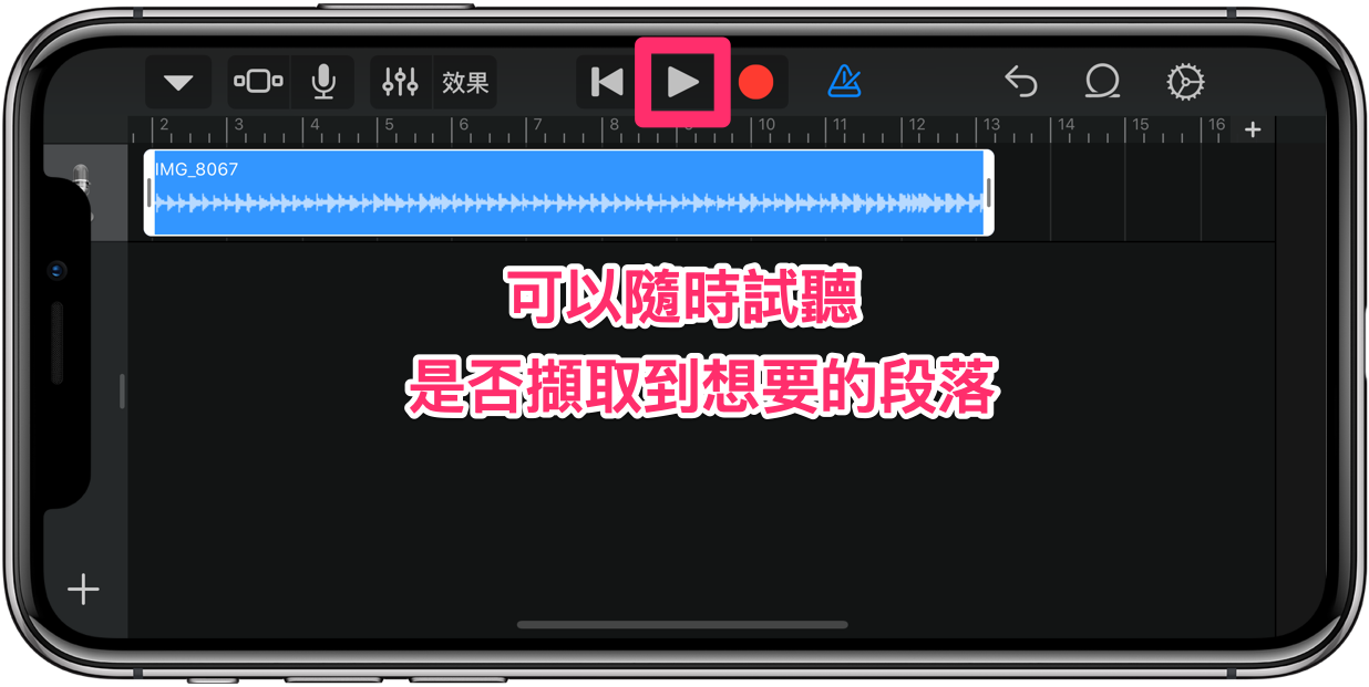 剪輯過程中隨時都可以按畫面上方中間的【▶︎】鍵,試聽使否擷取到想要的歌曲片段。