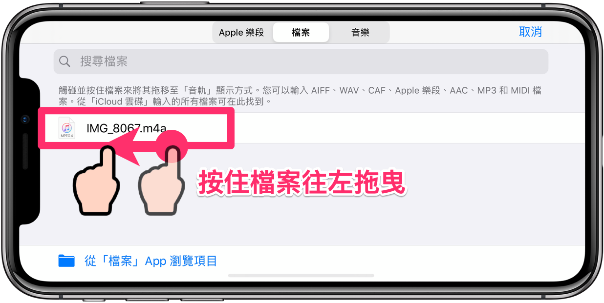 再來【點開想作為鈴聲的 M4A 檔】,然後將檔案【按著再往左拖移】,就能將音樂加到 GarageBand 錄音機的編輯區中。