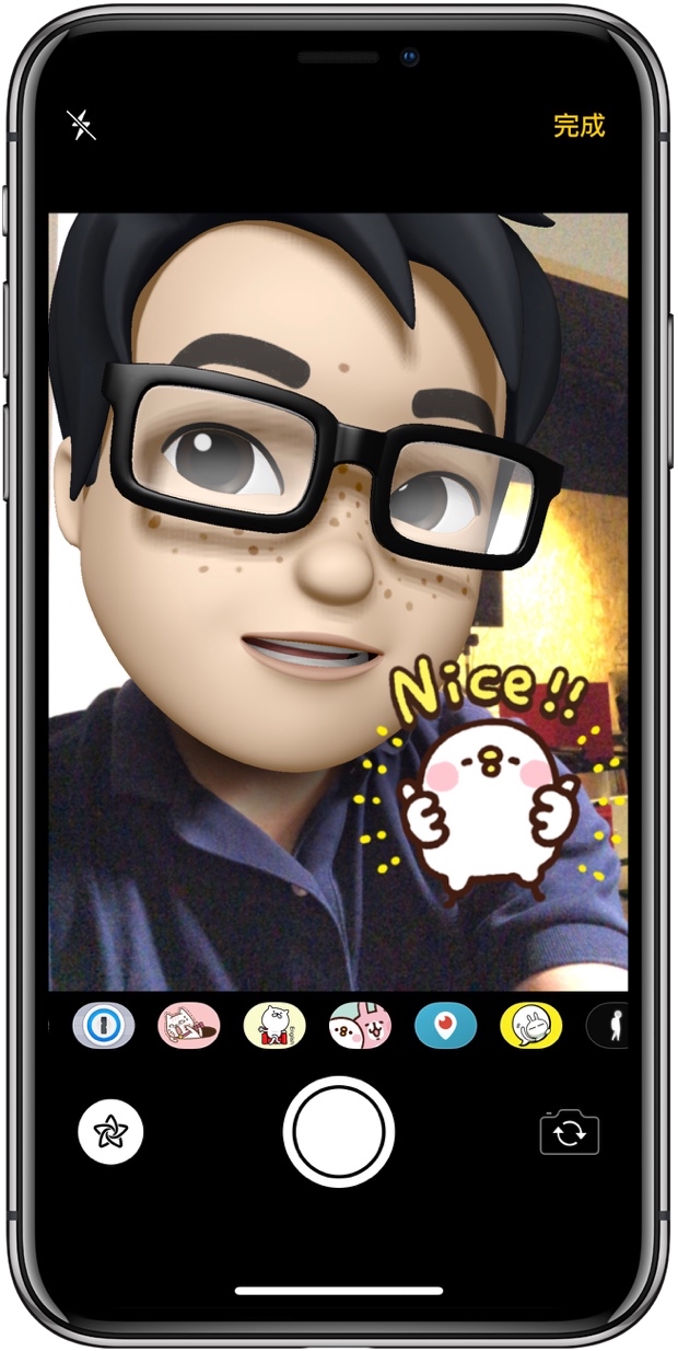 除了只有錄影或拍攝單純的 Memoji 外,我們也可以直接在自拍時將頭部換成自己的 Memoji ,是不是很可愛啊?