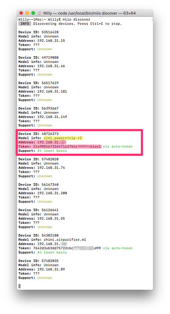 就可以看到現在所有連上 HomeBridge 的設備,可以看到 Model info:zhimi.powerstrip.v2 就是米家智能插線板,請將下方的 Address 及 Token 記下來。