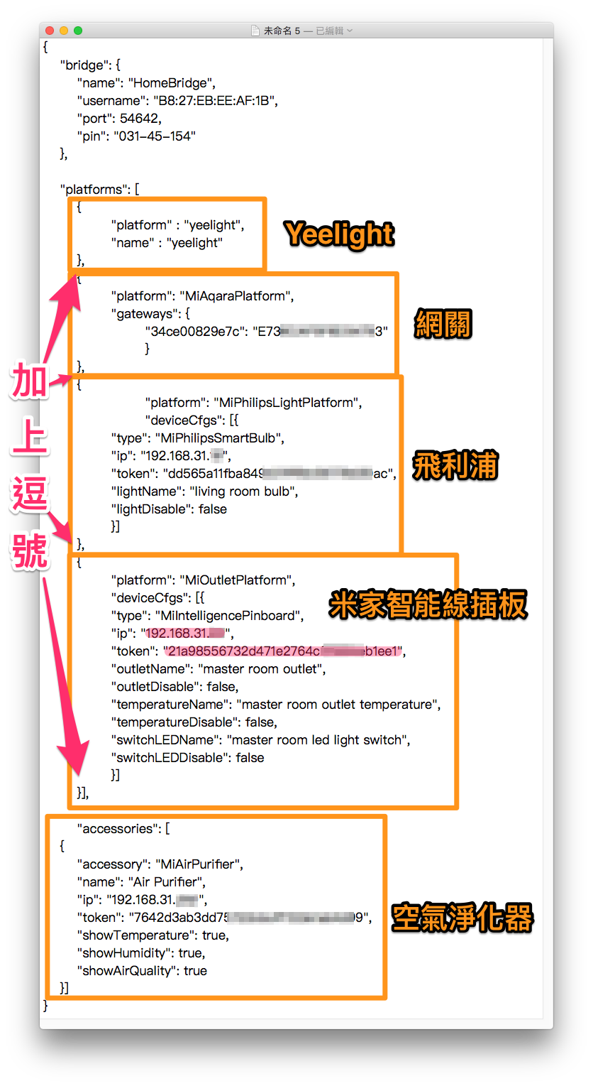 請直接將你自己需要的裝置代碼複製並貼至 config.json,直接接在之前內容之下(記得上面要加個逗號),再把「ip」及「token」修改成 Step 2 記下來「Address」及「Token」即可,貼上後大概會是這個樣子: