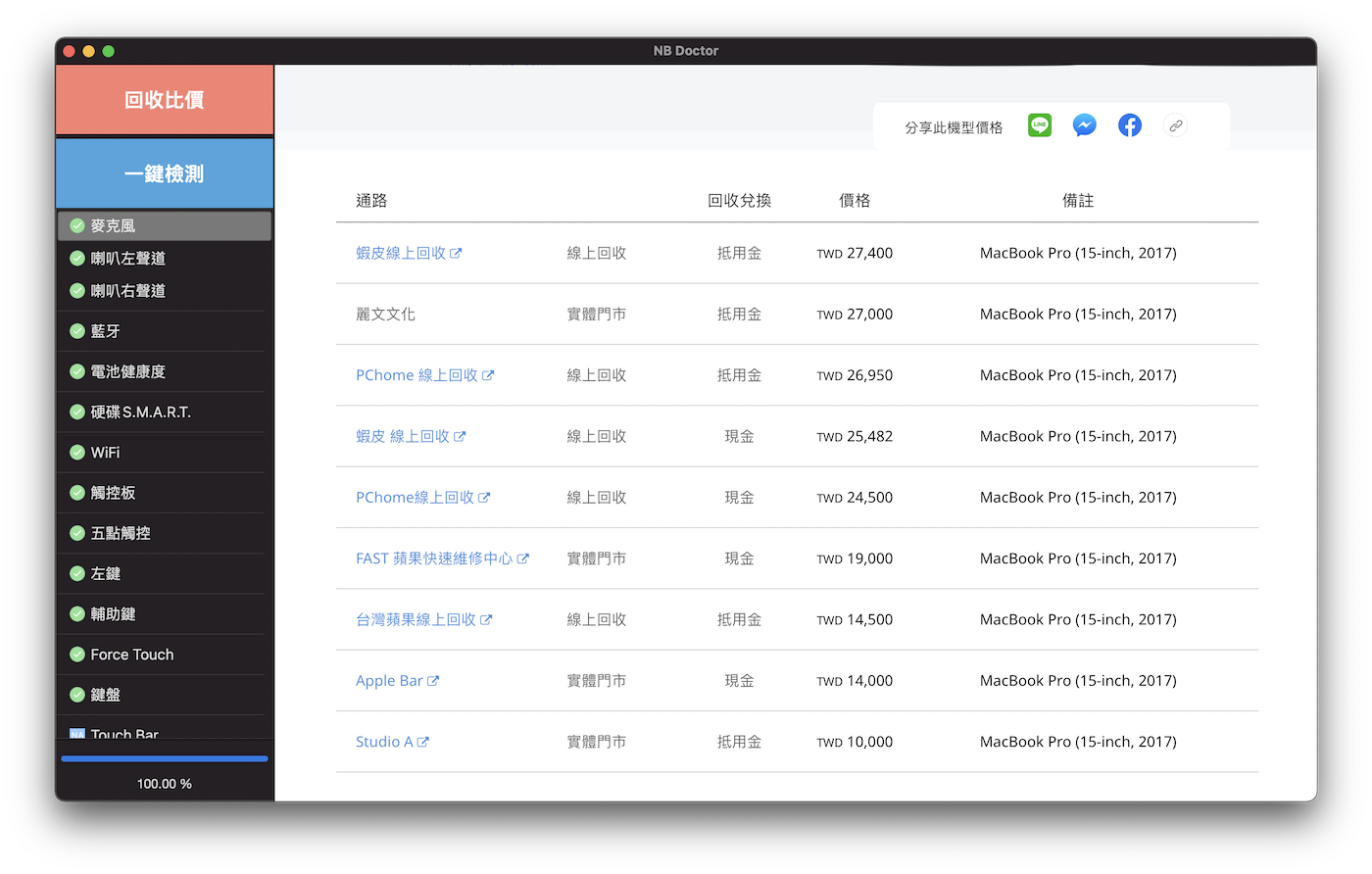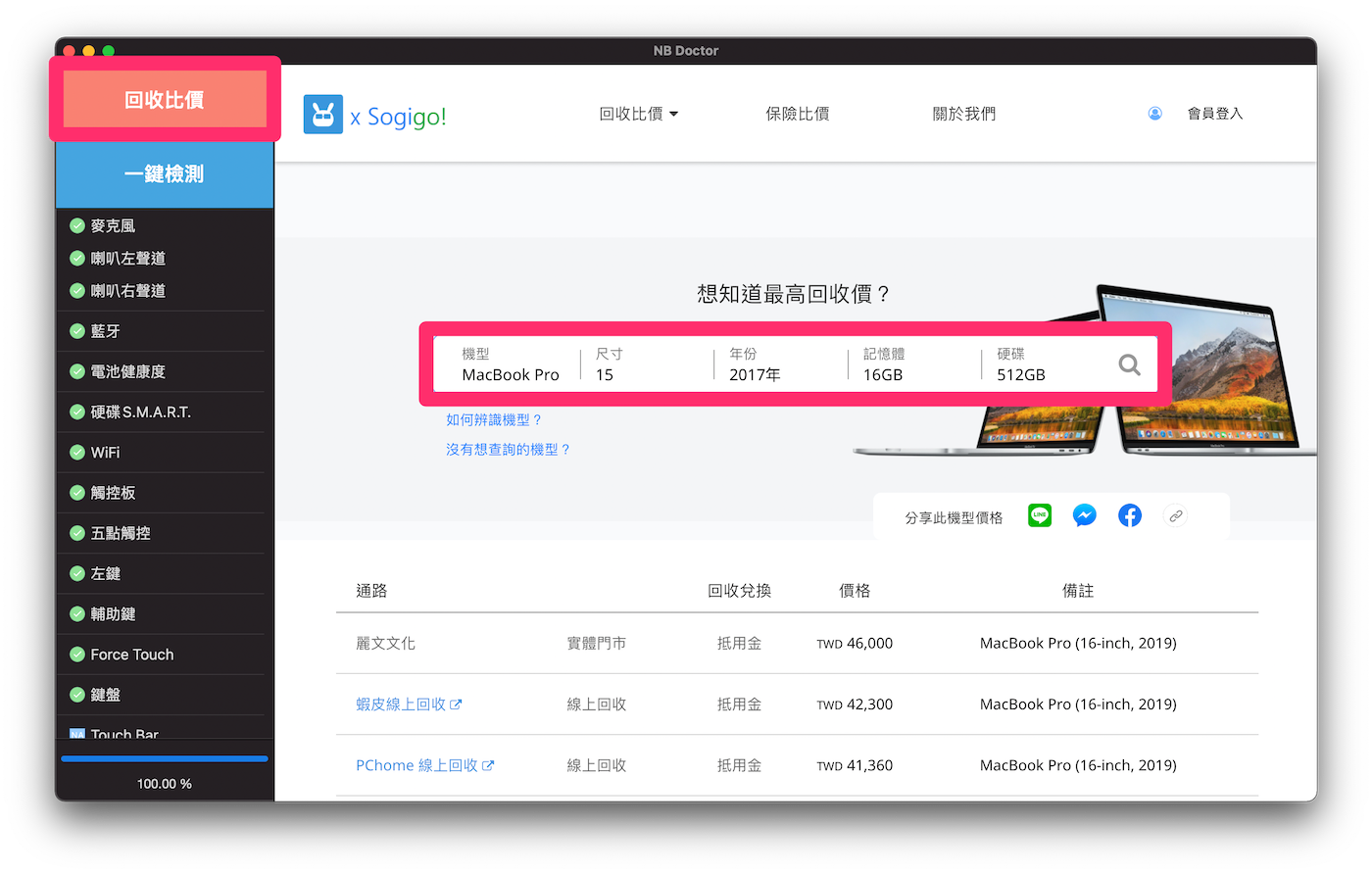 「筆電醫生 NB Doctor」除了可以省去許多自己研究測試的麻煩與時間,測試完成後還會生成一份精美的檢測報告,讓你一目瞭然所有狀況;尤其在 Macbook 二手交易中,不管是對於買家還是賣家,都多了一份保障,也可以降低交易糾紛的發生與買到雷機的風險;懶得自己販賣還可以透過回收比價系統來找尋最高的通路脫手,非常方便!