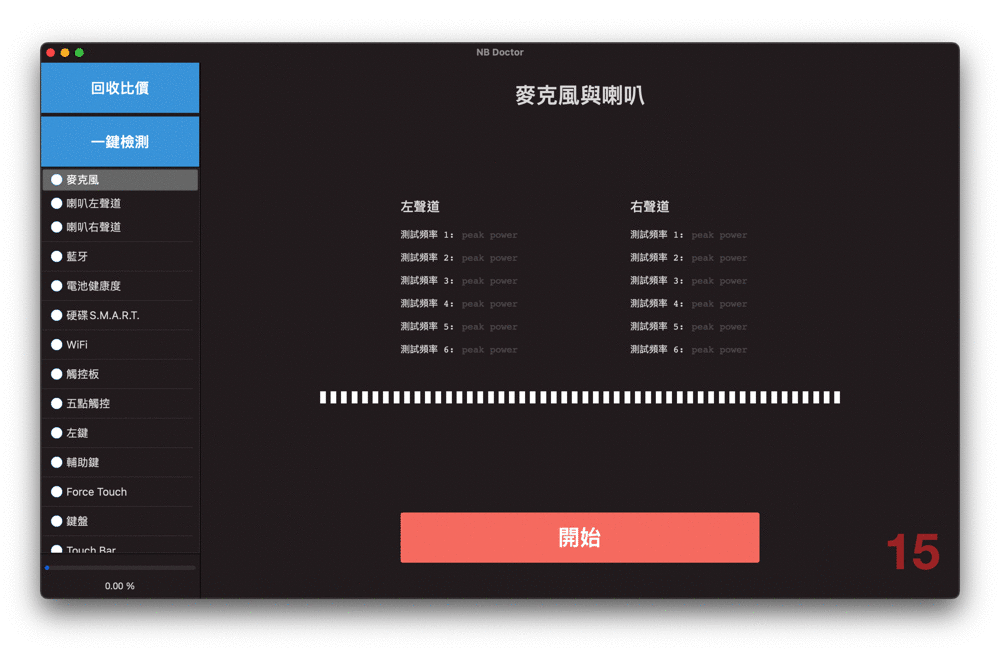 主畫面的左側有一系列的硬體檢測列表,第一個項目是「喇叭與麥克風」,按下【開始】後就會自動檢測,通過後左側就會有綠色勾勾確認硬體沒問題。