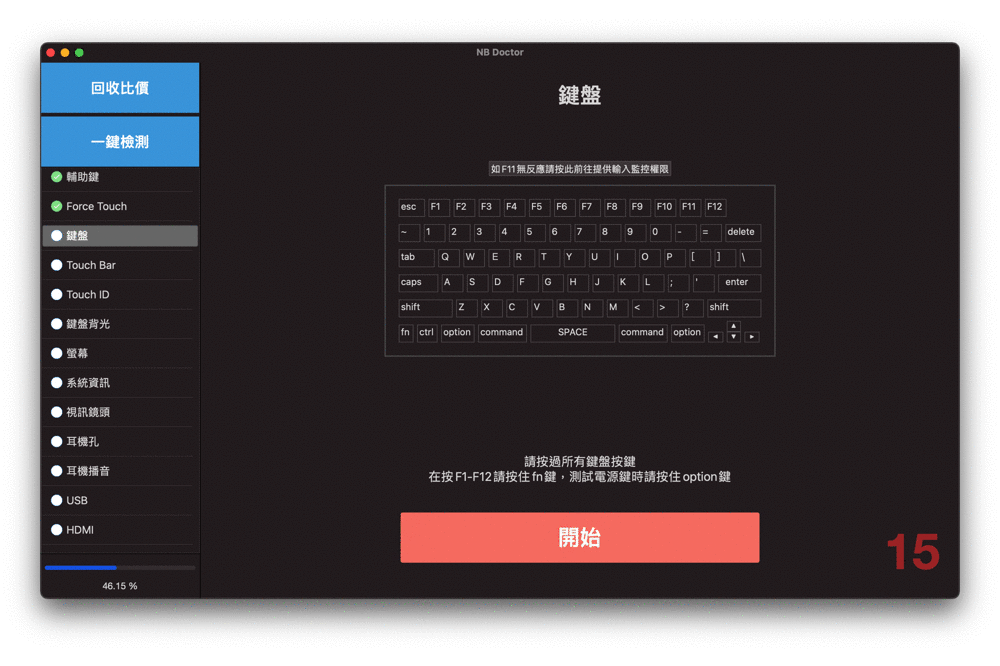 有些則是需要配合操作才能完成,像是鍵盤、觸控板、五點觸控、左鍵輔助鍵、Touch ID、鍵盤背光⋯等。
