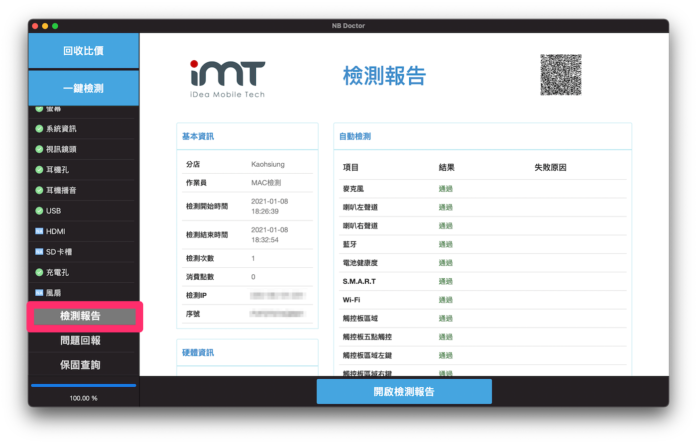 全部測試完成後,按下左下角的【檢測報告】就自動生成一份精美的列表,這台 Mac 的基本資訊、硬體資訊,以及各項檢測項目的結果,所有狀況都可以一目瞭然。