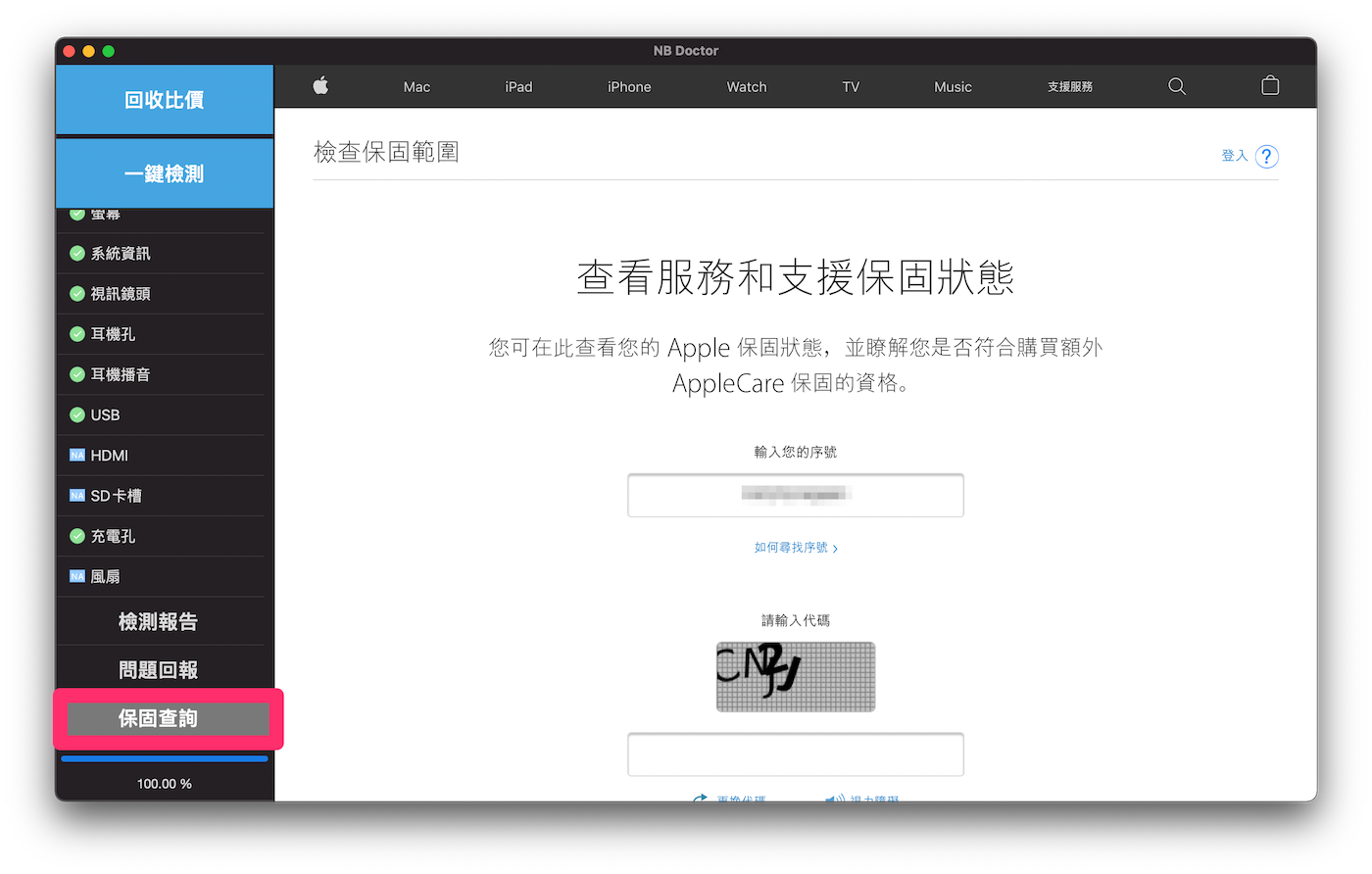 筆電醫生也很貼心的提供了「保固查詢」的功能,會直接把檢測中的這台 Mac 序號直接代入到 Apple 官網上檢查保固範圍的頁面。