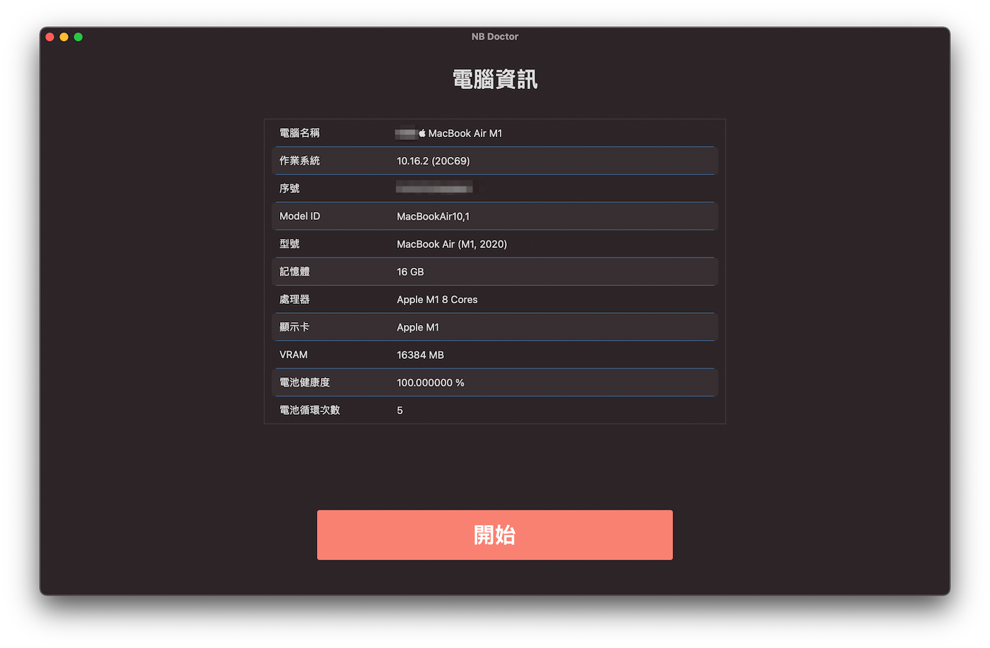 電腦醫生啟動後,即可立刻自動檢測出正在使用的電腦型號、作業系統版本、序號,還有基本的配備,威力這次測試的是新買的 M1 MacBook Air,資料欄中也可以看到是 16G 的記憶體、處理器是 8 核心 M1、顯示卡也是 M1,連電池循環次數都可以直接看到。