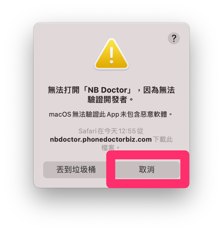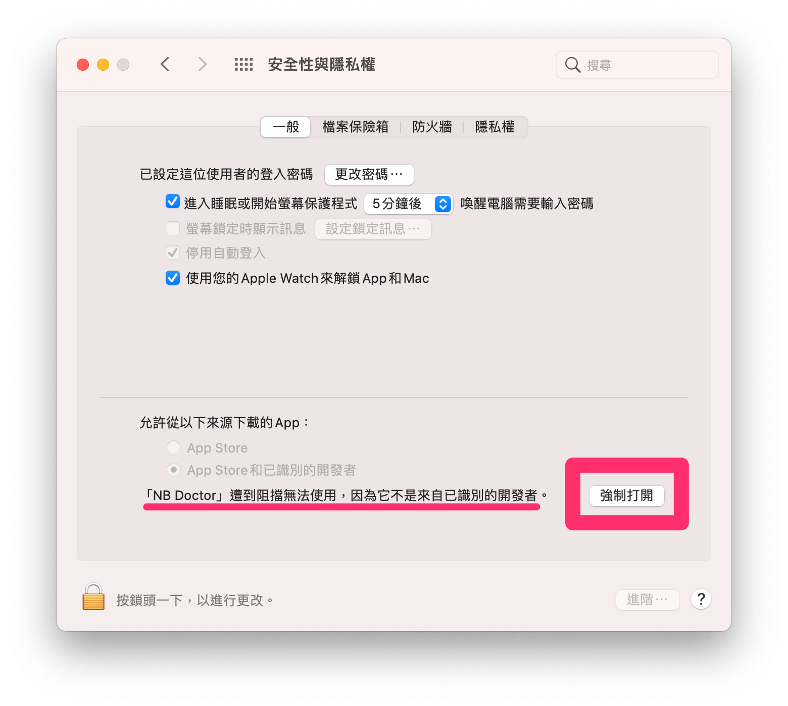 這時會顯示系統無法驗證開發者的提示,請選擇【取消】。 接下來請到「系統偏好設定」>「安全性與隱私權」,按下右下方的【強制打開】。