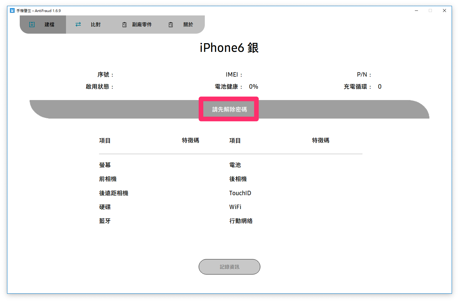 送修前先在【建檔】頁面按下方的【記錄資訊】,將自己的 iPhone 資訊記錄好,送修回來再用【比對】功能來檢查是否有被偷換副廠的零件就好。
