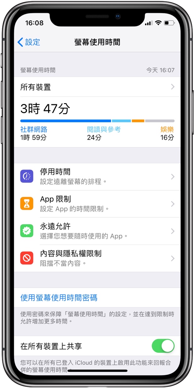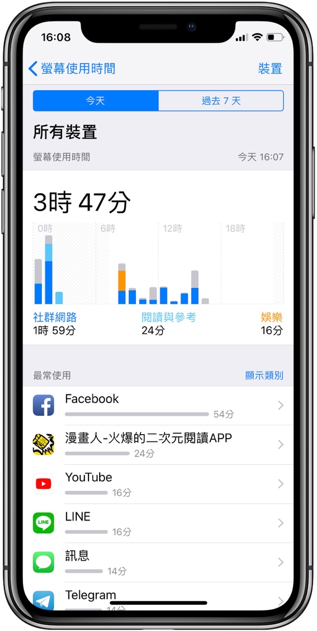 蘋果這次就推出了 螢幕時間 (Screen Time) 這項功能。你可以從設定當中看到你一天裡花了多少的時間在什麼樣的 App 當中,並加以限制一天在社群網站或娛樂用 App 的時間。