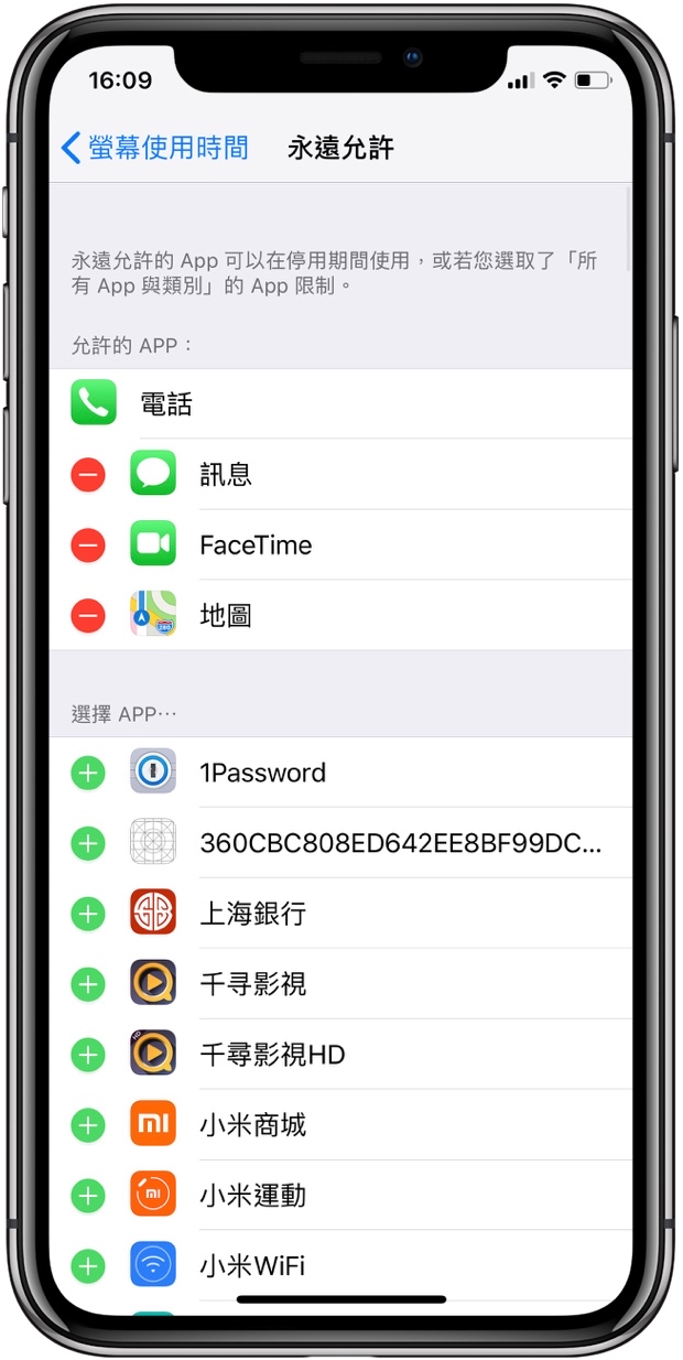 你也能設定哪些 App 是可以永遠允許使用的,像是電話、訊息、地圖這些比較重要的 App 在預設當中就沒有限制。