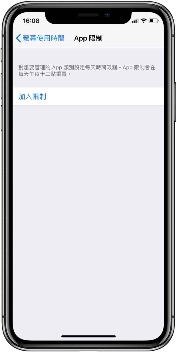 在「螢幕使用時間」這項功能當中,我們還可以限制 App 的使用時間。首先點選 App 限制,然後選擇「加入項目」。