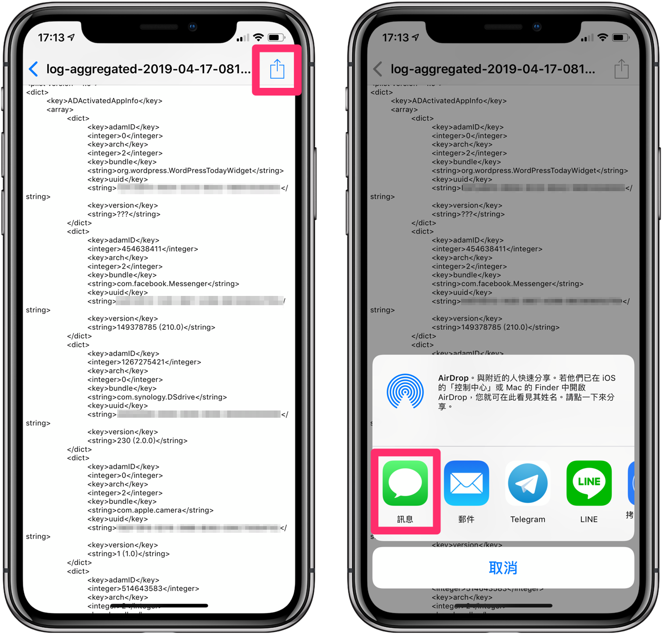 開啟《訊息》後在剛剛傳給自己的【log-aggregate… 檔案】上點一下,然後點畫面左下角的【分享】。