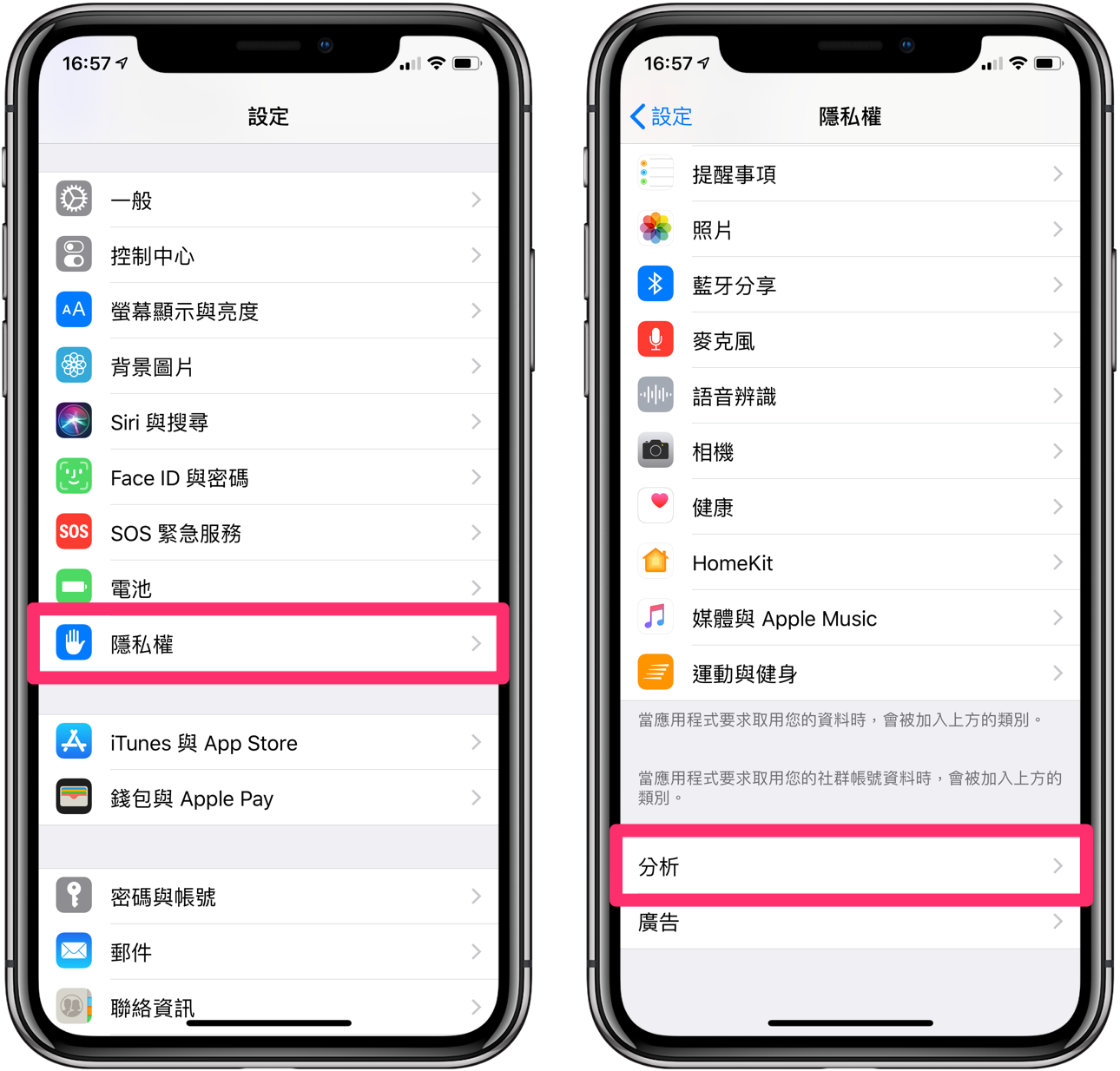 開啟《設定》,一樣先進入【隱私權】頁面最下方的【分析】項目。