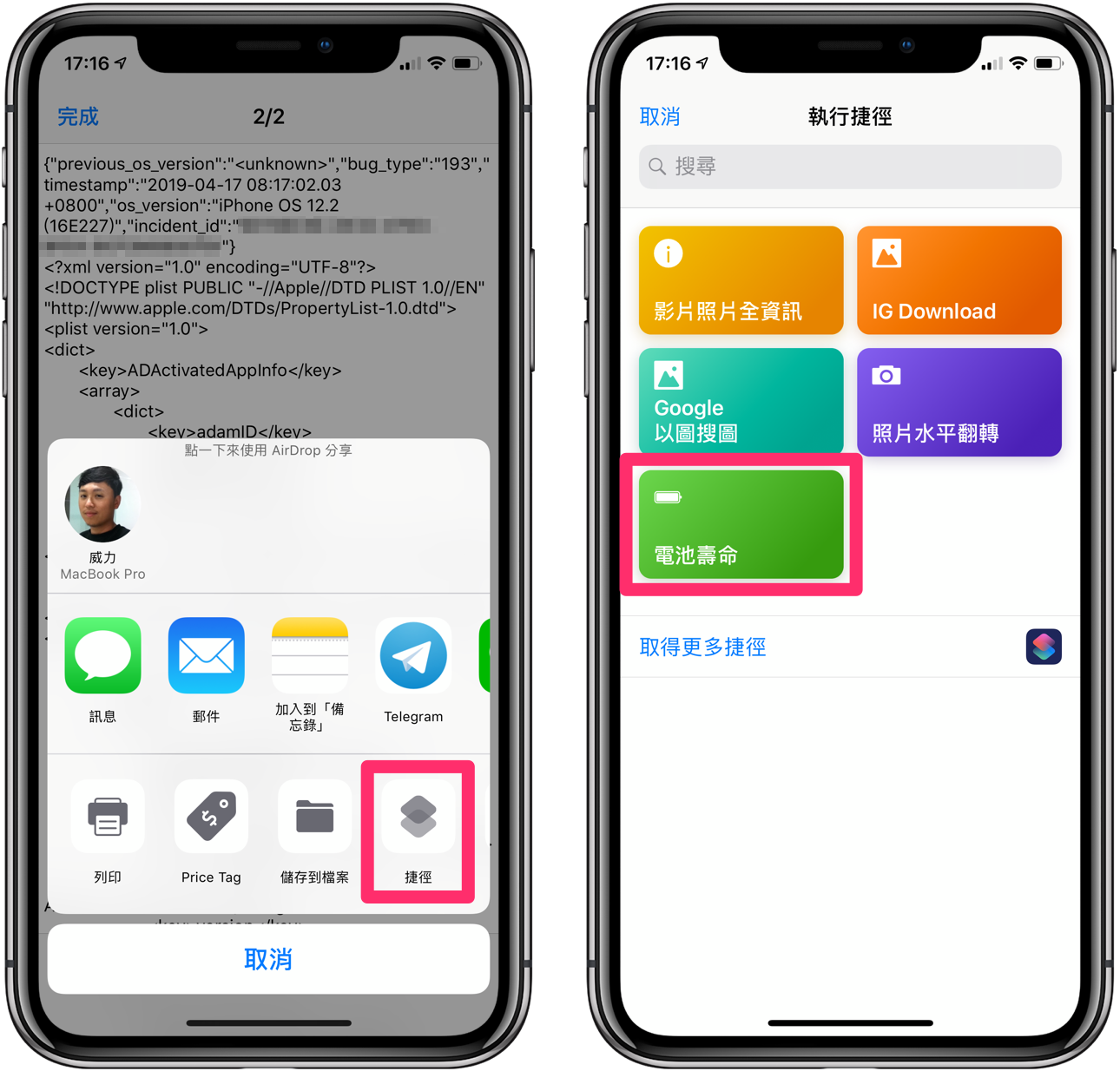 在剛剛的分享列表中按下【捷徑】,再點選【電池壽命】捷徑。
