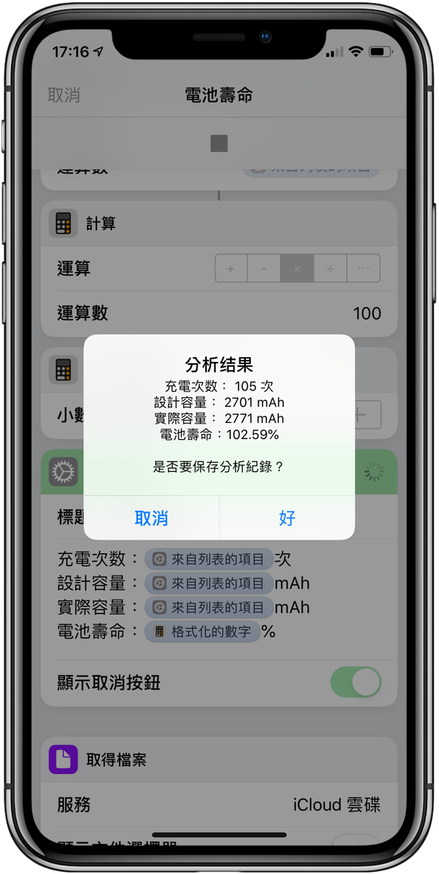 另外,如果想要保存本次分析紀錄以供近期查看,只要按下視窗的【好】,之後開啟《捷徑》直接點一下【電池壽命】捷徑。