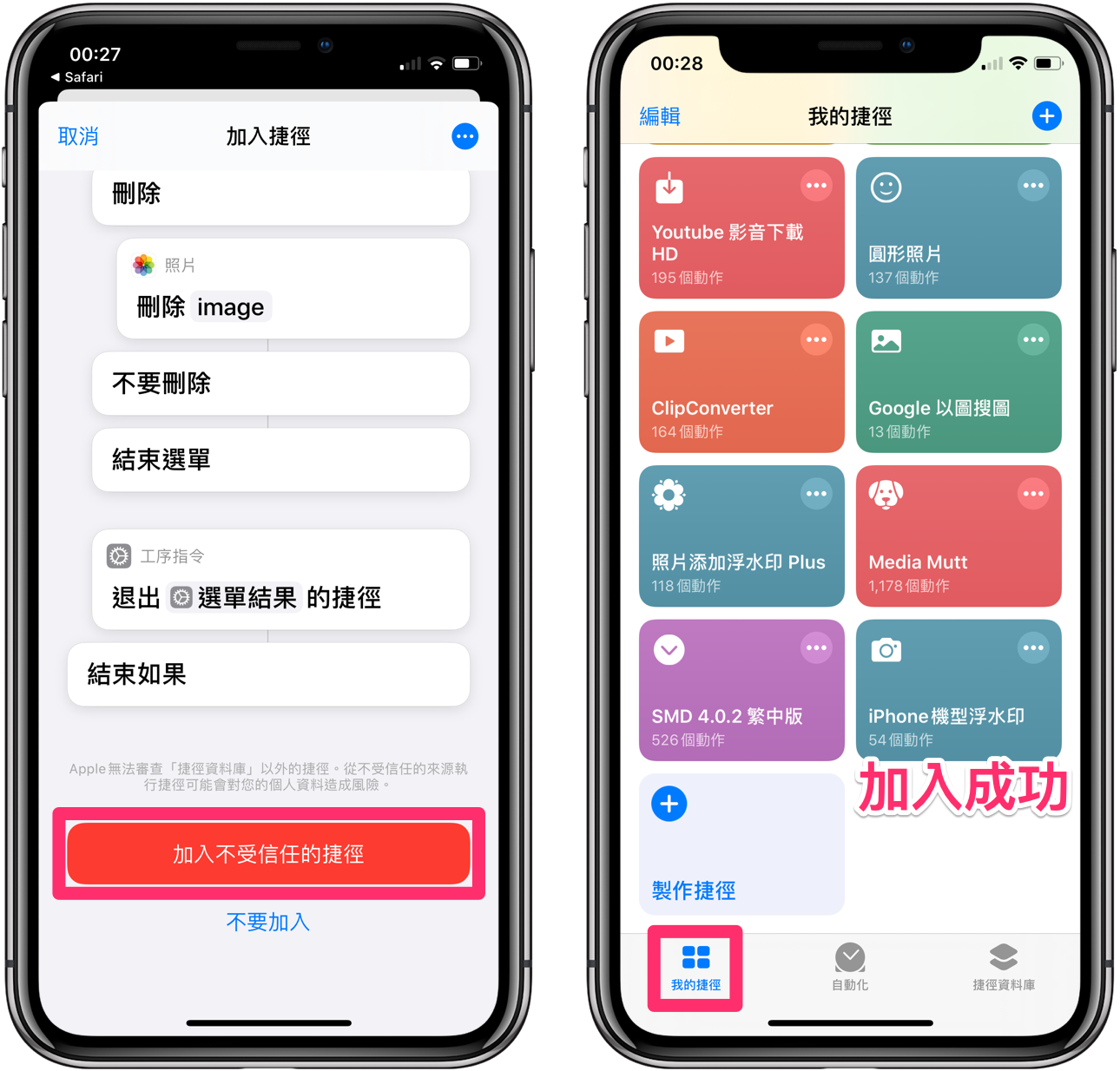 接著請放心按下【加入不受信任的捷徑】按鈕,看到「我的捷徑」內出現「iPhone 機型浮水印」的圖示,就表示已完成捷徑的下載囉!