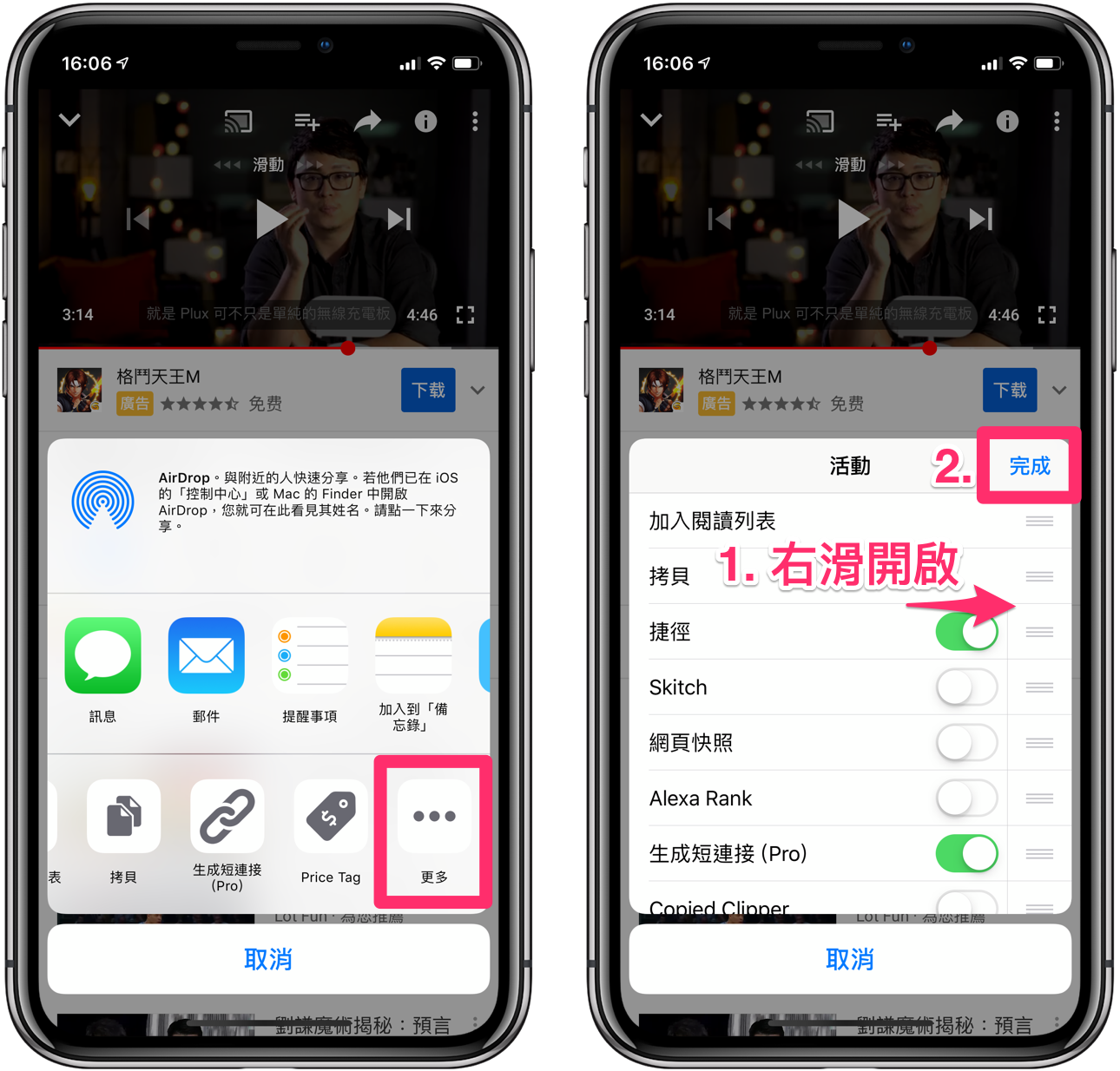 再一次點選畫面列表最右方的【更多】,然後將活動選單上的【捷徑】按鈕向右滑動開啟,最後點右上角【完成】。