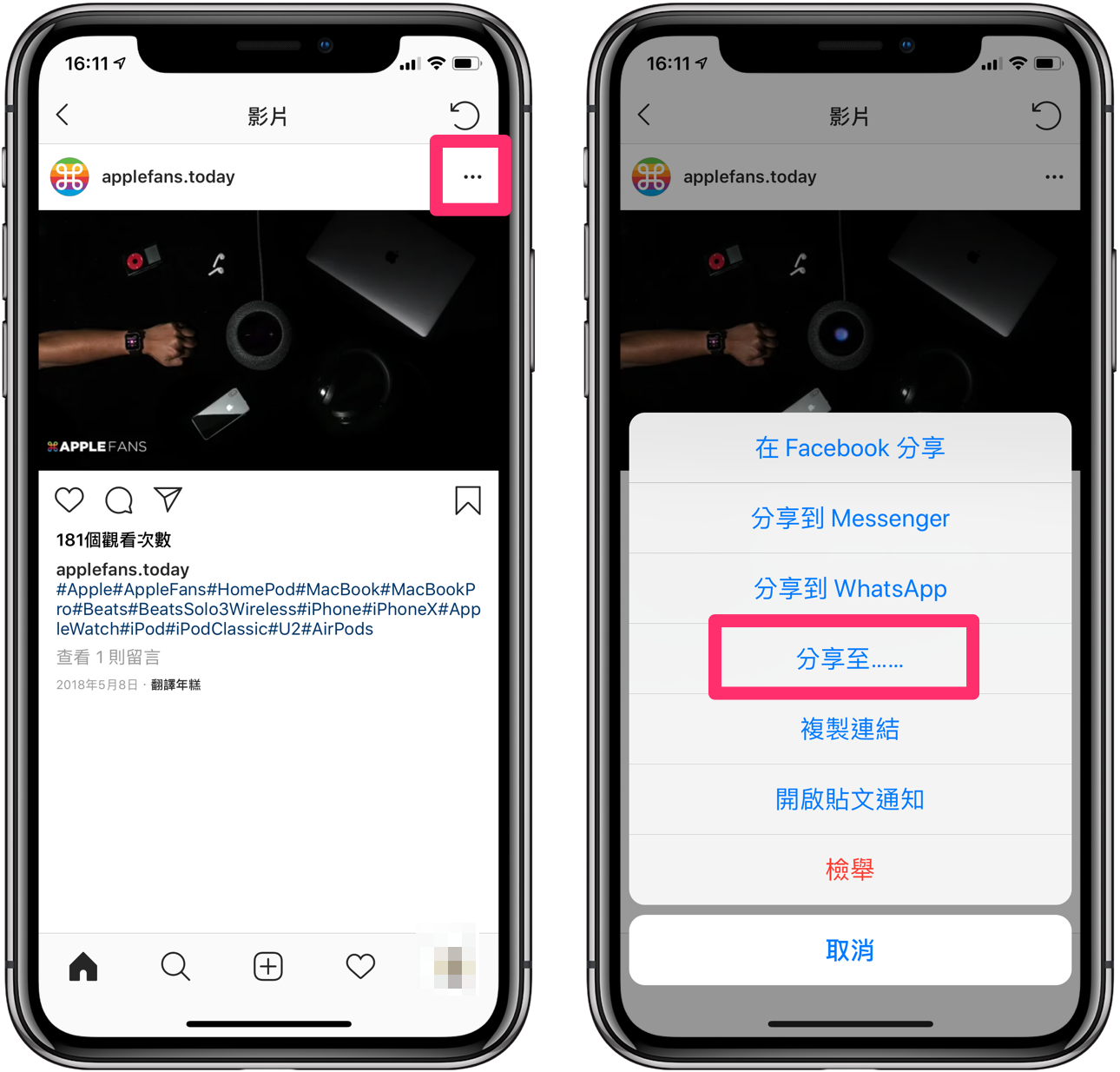 打開 Instagram 找到想要下載且設定為「公開」的影片,按右上角的【⋯】按鈕。接著選擇【分享至……】。