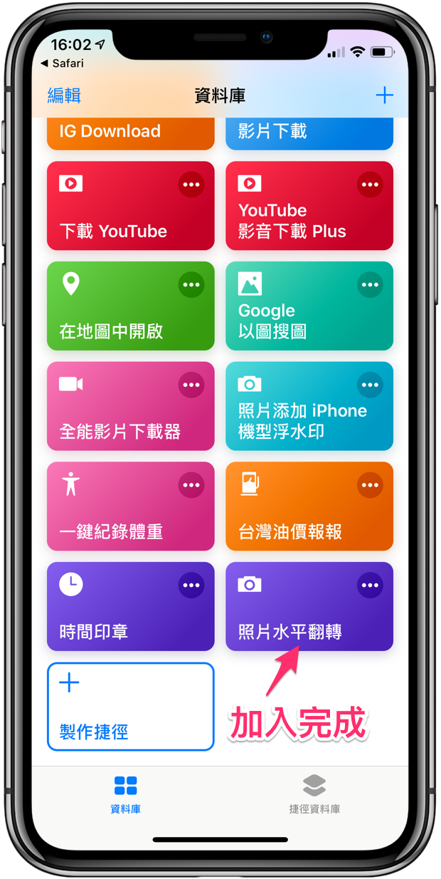 看到資料庫內出現「照片水平翻轉」的圖示,就表示已完成捷徑的下載。