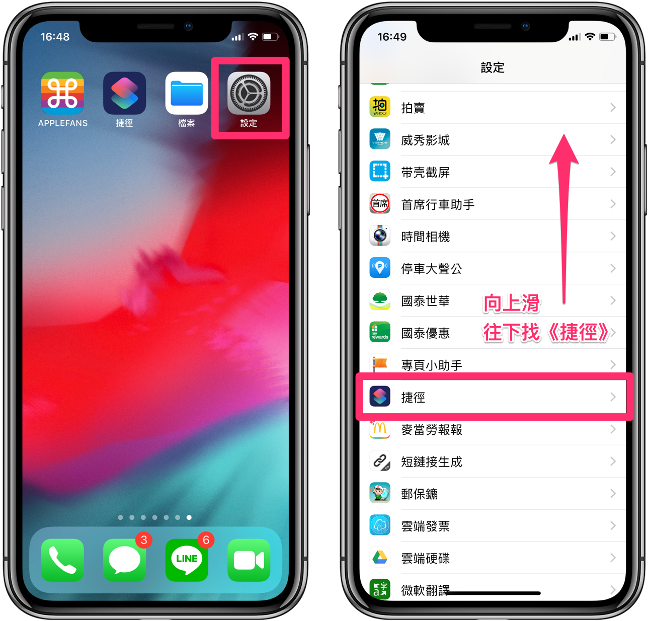 開啟《設定》,向上滑動往下找到【捷徑】然後點一下。