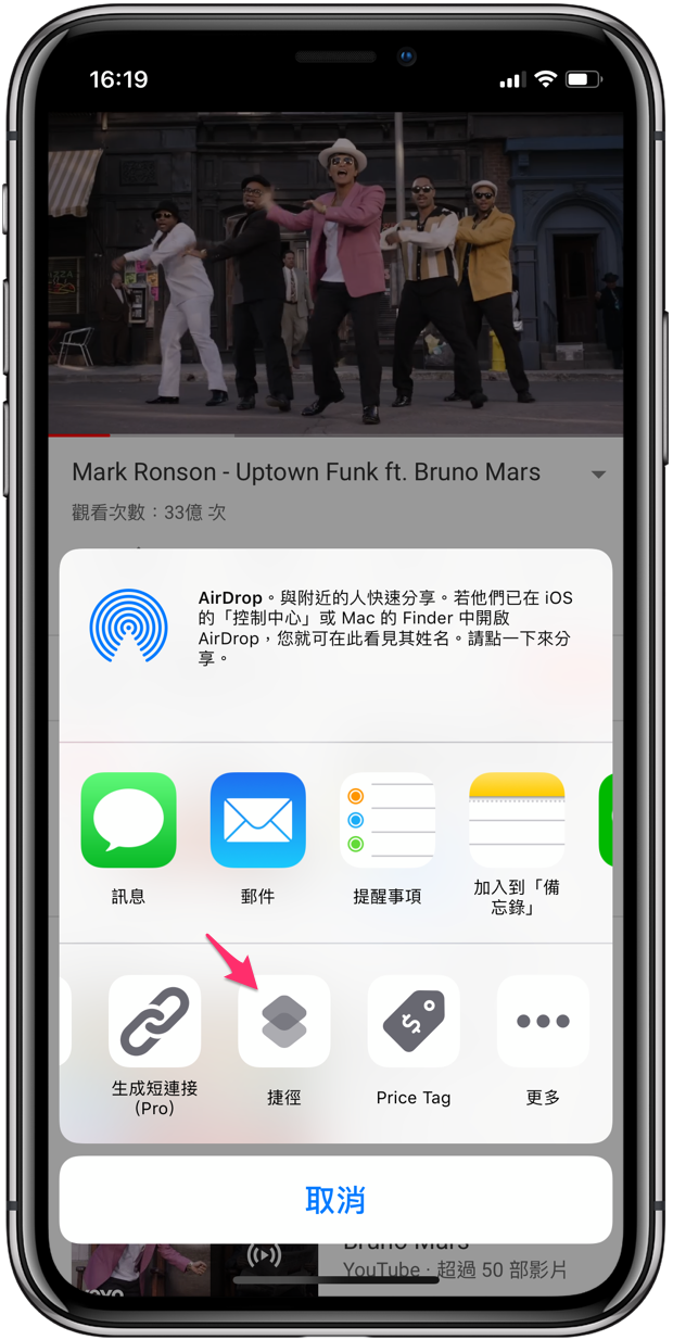 ⌘ Step 1. 透過 YouTube 的【分享】執行《捷徑》