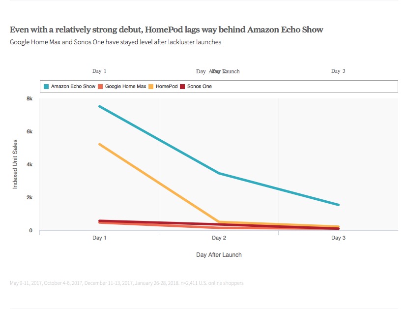 Slice 表示,HomePod 的發售當天,訂購量達到了 Sonos One 的 9 倍、Google Home Max 的 11 倍,不過 HomePod 並沒有擊敗 Amazon 的 Echo Show。