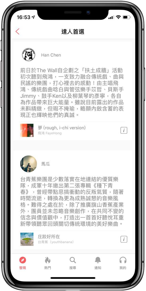 在首頁除了能看到許多推薦專輯和單曲,還有「達人首選」頁面,裡面是個個音樂人對於專輯做的推薦詞,用戶可透過敘述內容,找到符合自己期待的作品。