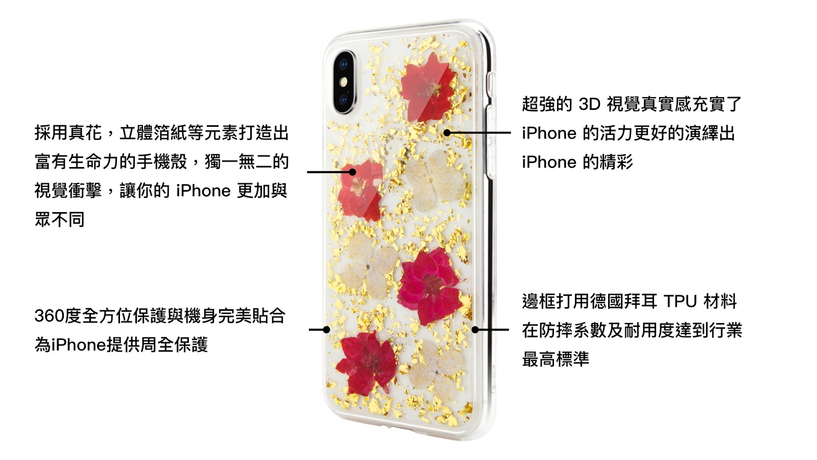 - 採用真花、貝殼、星星、立體箔紙等元素打造出富有生命力的手機殼,讓你的 iPhone 更加與眾不同
