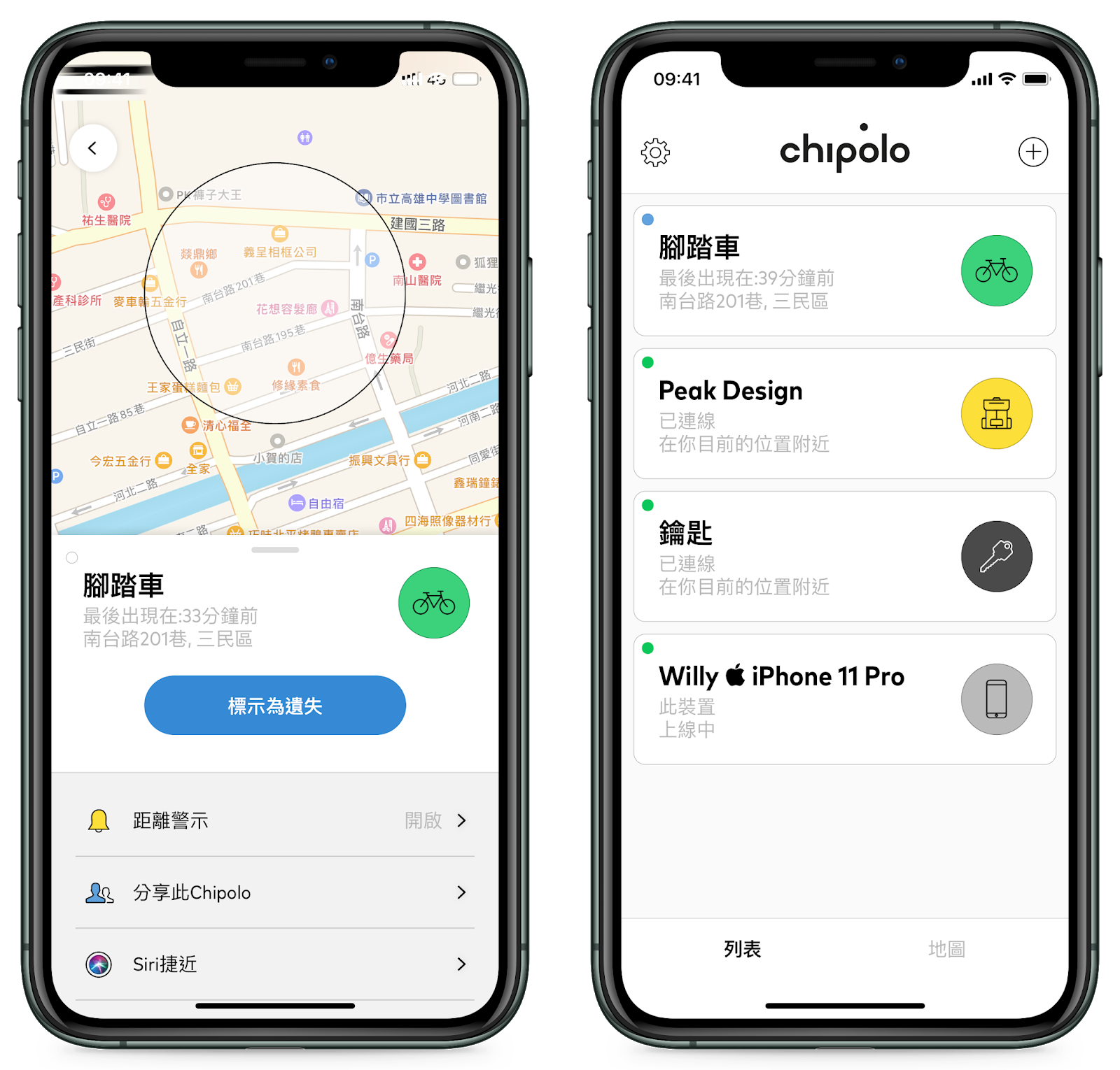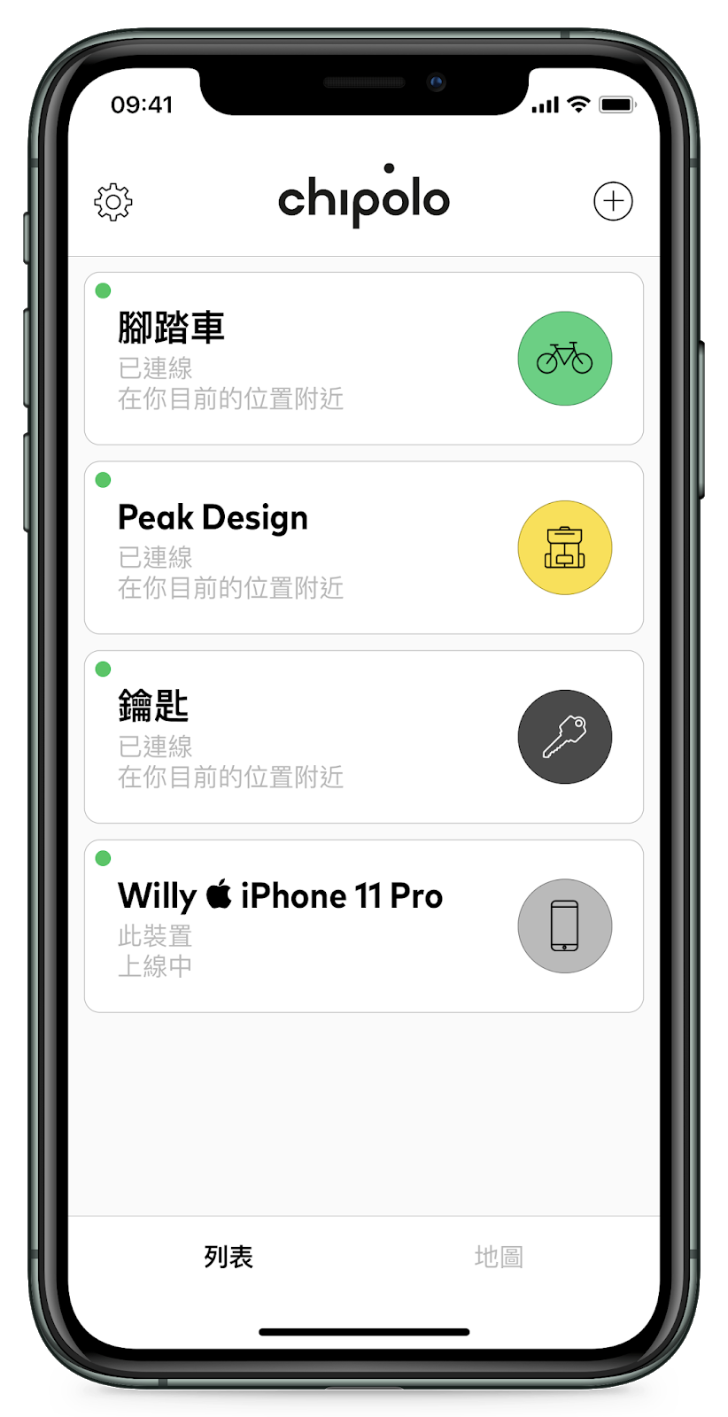 將 Chipolo 都加入 Chipolo App 後,依照裝置設定好對應的圖示和名稱,系統還會直接幫你配對好相對應的顏色。