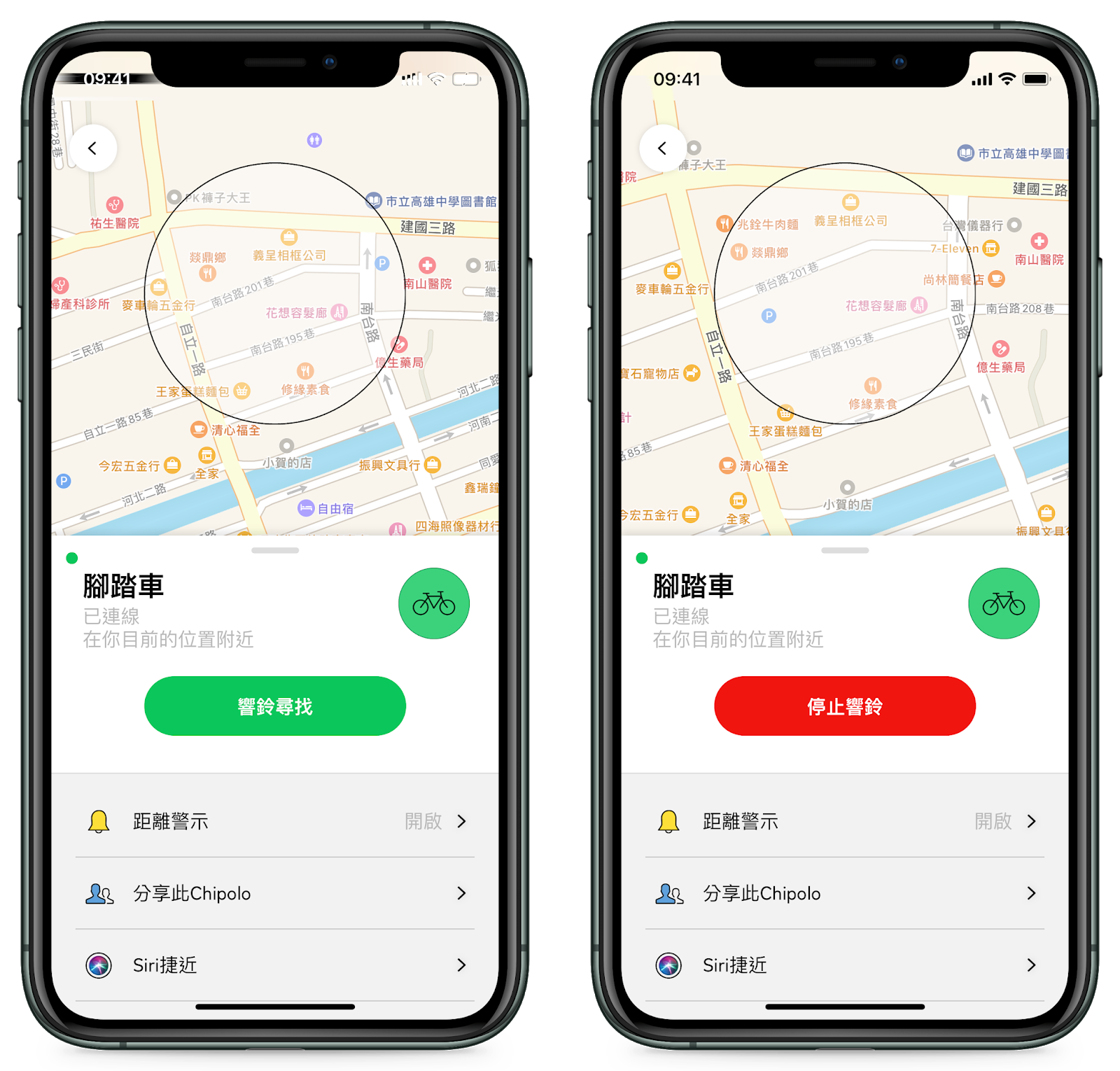 反過來當然也沒問題。如果騎腳踏車出去停在停車場,結果忘了停放的位置,只要距離 60 公尺以內,就可以在 Chipolo app 裡按下「響鈴尋找」,黏在車上的 Chipolo 就會開始發出高達 120dB 的鈴聲,讓你一秒就跟心愛的腳踏車重逢,不用走路回家。
