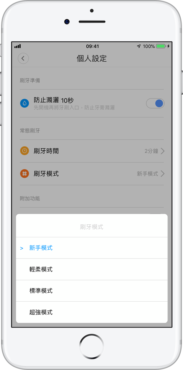 由於我是第一次使用電動牙刷,起初幾天對震動的感覺真的不太習慣,所以先從預設最弱的「新手模式」開始使用,到現在除了某天嘗試過標準之後,到現在仍離不開新手模式。