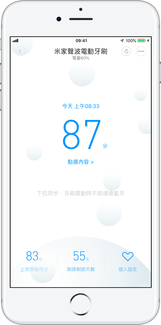 點進來後,主畫面就能看到上次刷牙的得分;若發現日期很舊,要記得下拉畫面使它重新連結牙刷,以回傳最新的資訊。