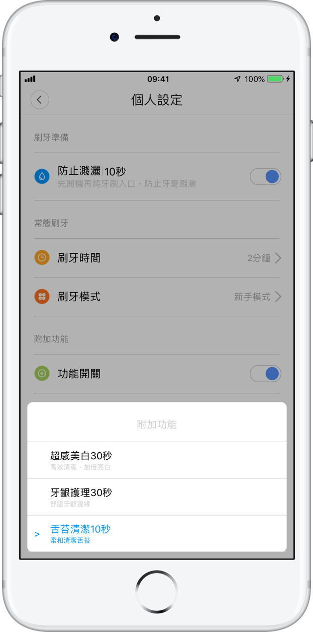 附加功能是指,常態刷牙結束後,最後再額外加上的一個小循環(下面使用心得會詳細說明),可依個人喜好做選擇。