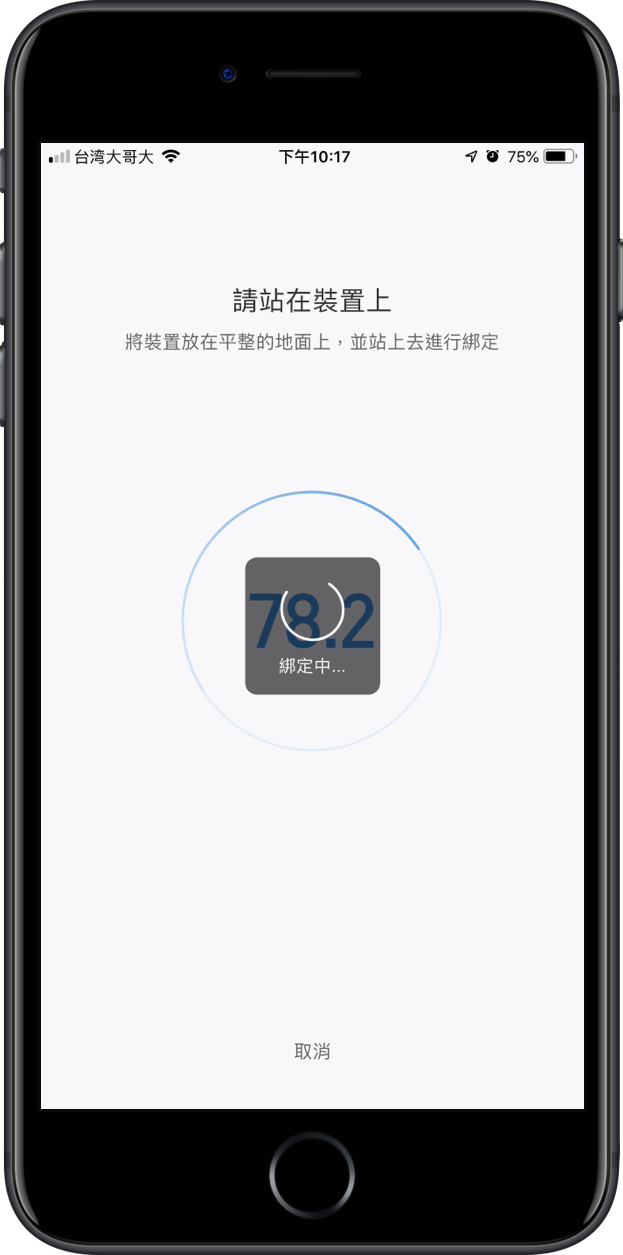 點選後就要開始進行配對了。配對的方式很簡單,直接站到體重計上方就會開始與手機配對。