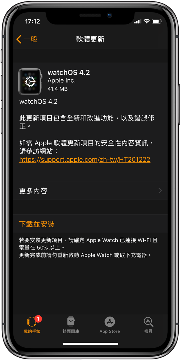 watchOS 4.2 可以直接透過 iPhone 上的 Watch App > 設定 > 一般 > 軟體更新 直接下載更新檔案。只要 Apple Watch 在 iPhone 的有效連接範圍內,而且電量高於 50% ,並連接充電器,即可開始更新。