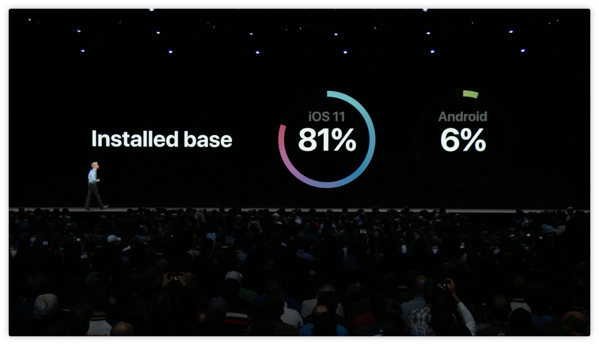 目前十億個 iOS 設備中有 81% 已更新到 iOS 11,而 Android 只有 6% 的裝置更新到最新版本。
