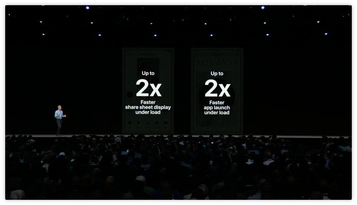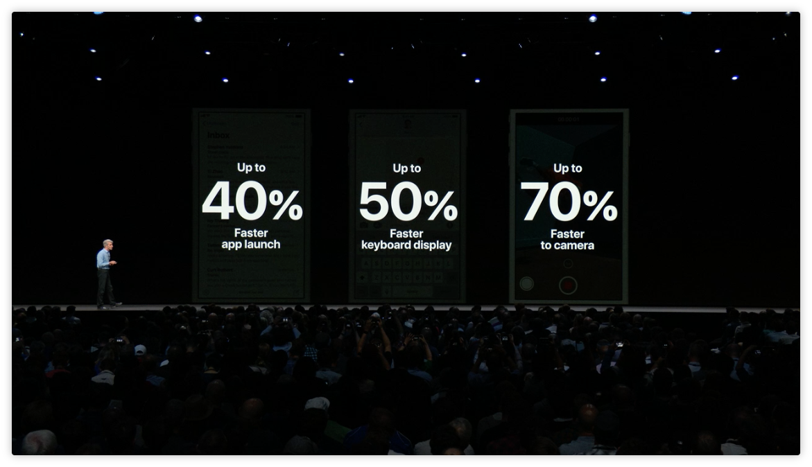 在 iOS 12 中,應用程式的啓動速度提高了40%,鍵盤的啓動速度提高了50%,在舊設備上打開相機的速度提高了70%。