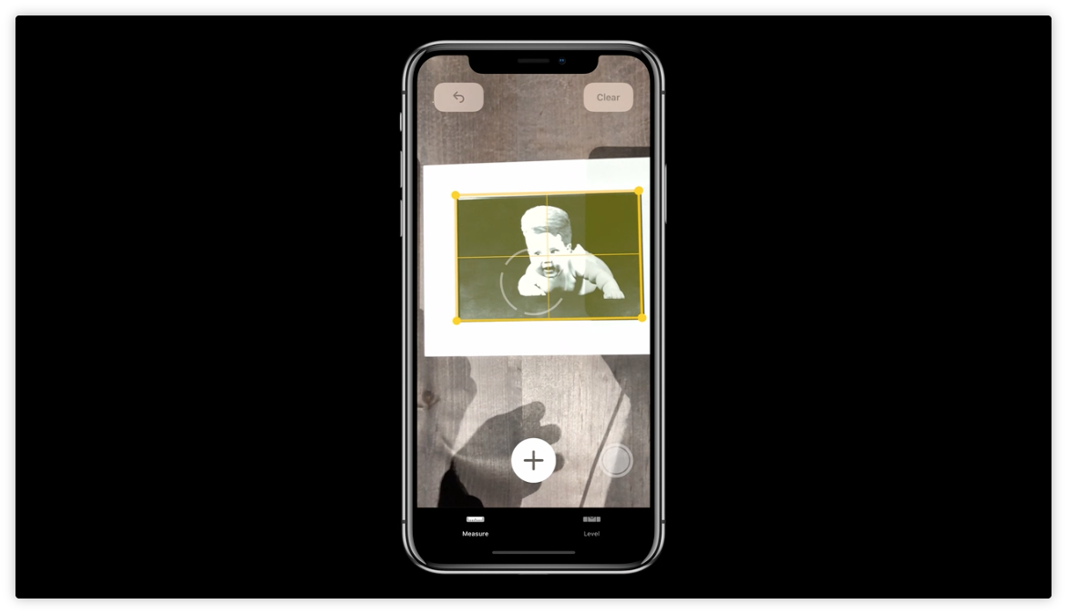 打開 Measure,將攝像頭對準某個現實物體,將 4 個角落框好,就會得出測量結果。