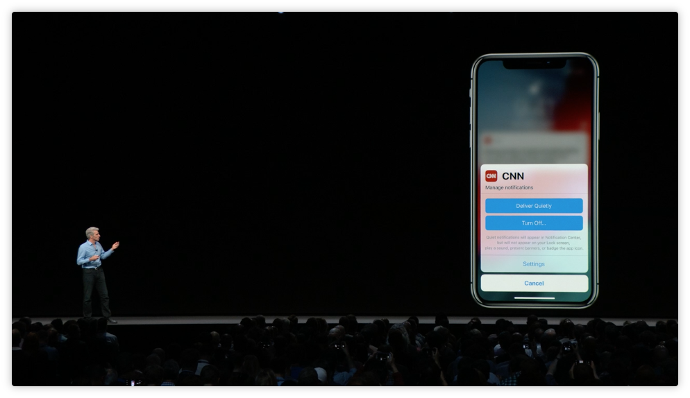 Deliver Quietly(安靜通知)則是讓使用者更方便將 App 推送的通知靜音,可以設定不顯示在鎖定畫面,也不出聲,也不會在 app 右上角有擾人的未讀數字。